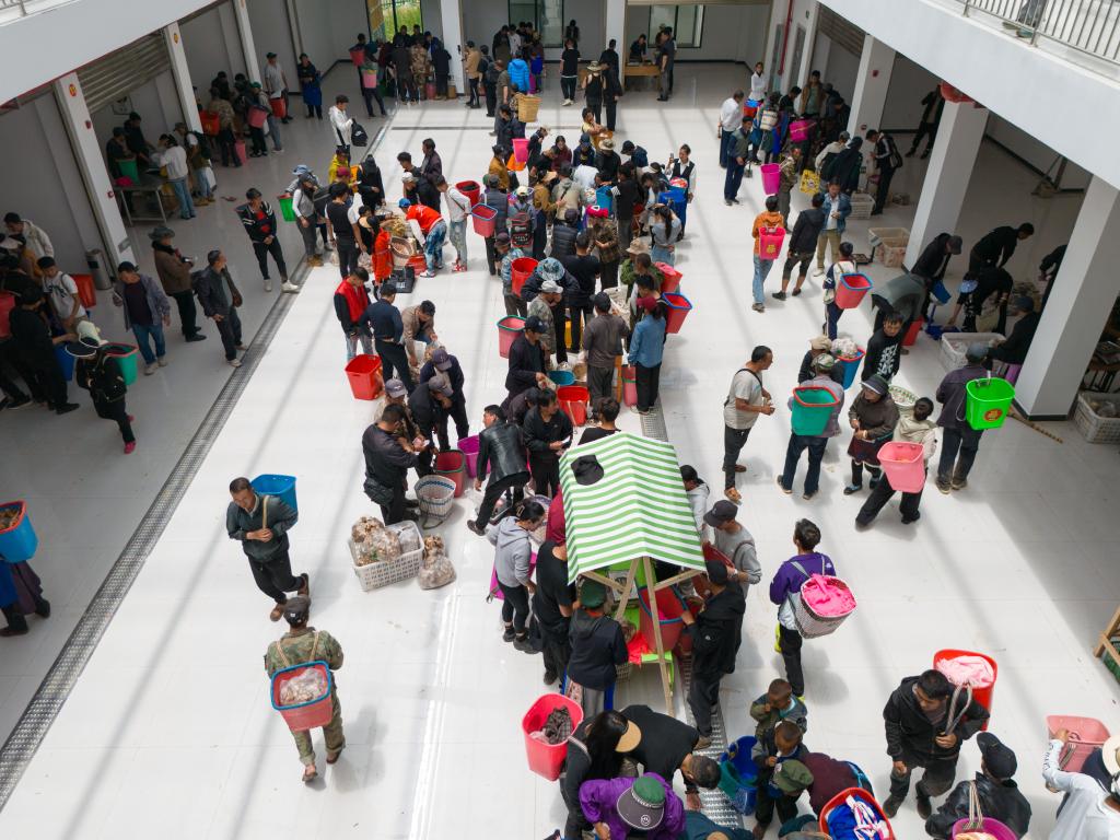 下午2点,吉迪村松茸交易市场准时开始交易。身着粗布藏装的老人背着背篓、拎着袋子涌进交易大厅,报价、验货、称重一气呵成,最快两分钟就能完成交易,而他们当天采摘的松茸也迅速通过冷链车发往各地。