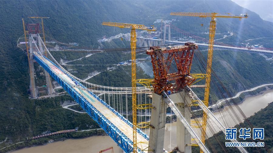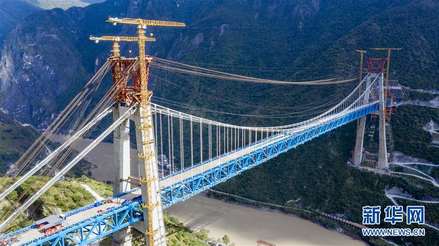 丽江至香格里拉铁路金沙江特大桥实现合龙(10月13日摄,无人机照片)。 随着最后一段重达640吨的钢桁梁吊装到位,由中国中铁二院设计、中国中铁大桥局承建的丽江至香格里拉铁路金沙江特大桥13日实现合龙,为丽香铁路如期通车打下了坚实基础。 新华社发(陈畅 摄)