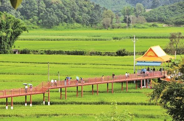 翠绿的稻田、红色的景观桥、金黄色的凉亭,与山水田园融为一体。芒市风平镇介桃村,秀美的乡村风光让人流连忘返。 眼下正是菠萝成熟时节,在介桃村举办的菠萝节更是吸引来了八方游客。村里游人如织,进村的小轿车排成长龙。